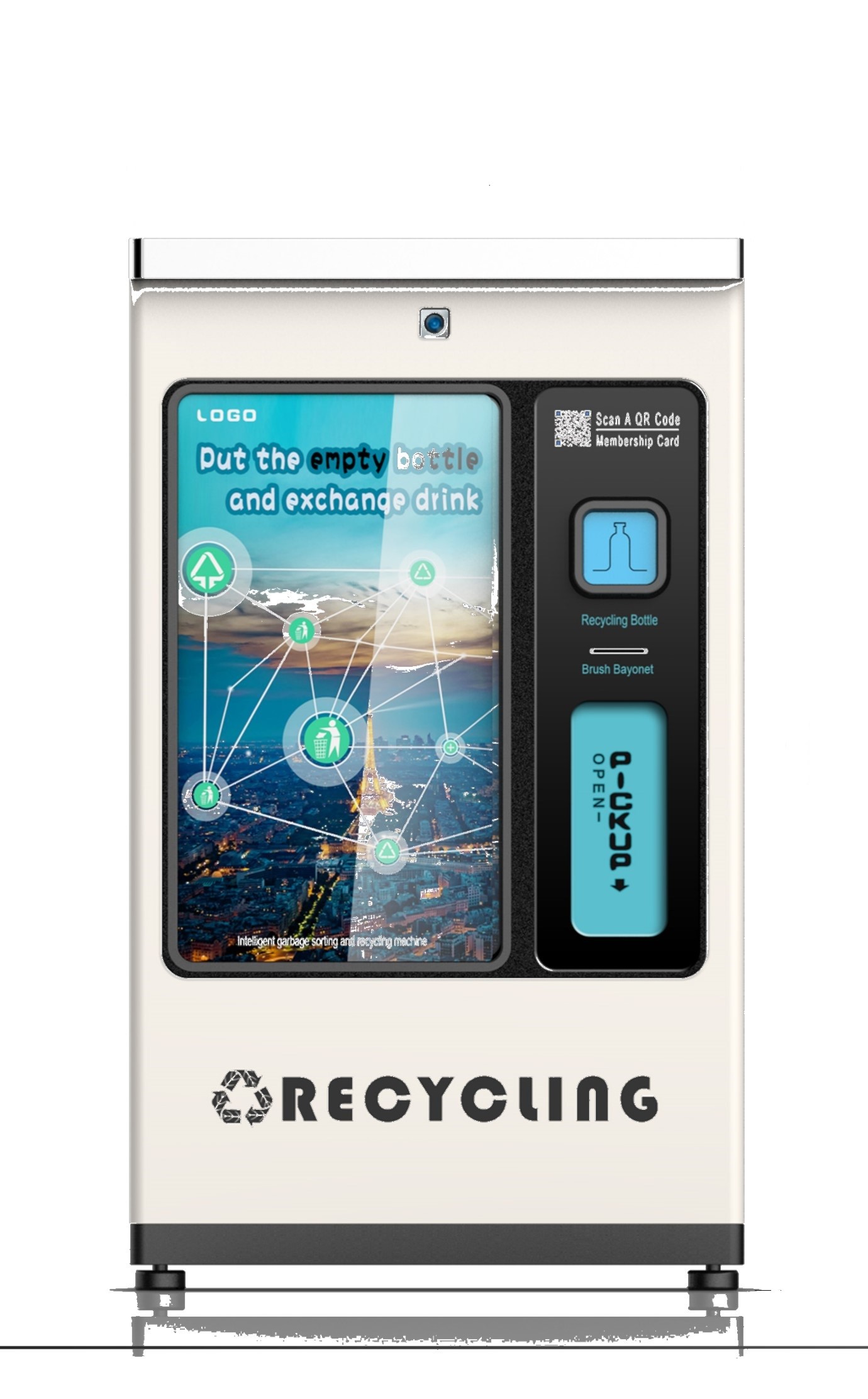 RVM-3103 맵시있는 반대 자동 판매기 (RVM) 디자인은 재활용 플라스틱 패트병을 받아들이고, 알루미늄이 통조림으로 만들고 안경이 병에 담습니다. 플라스틱 병과 금속 캔, 유리병을 위한 부드러운 드롭 시스템을 압축하는 압축기 모듈에서 설립되세요. 위로 그렇게 하기 위한 기억 용량